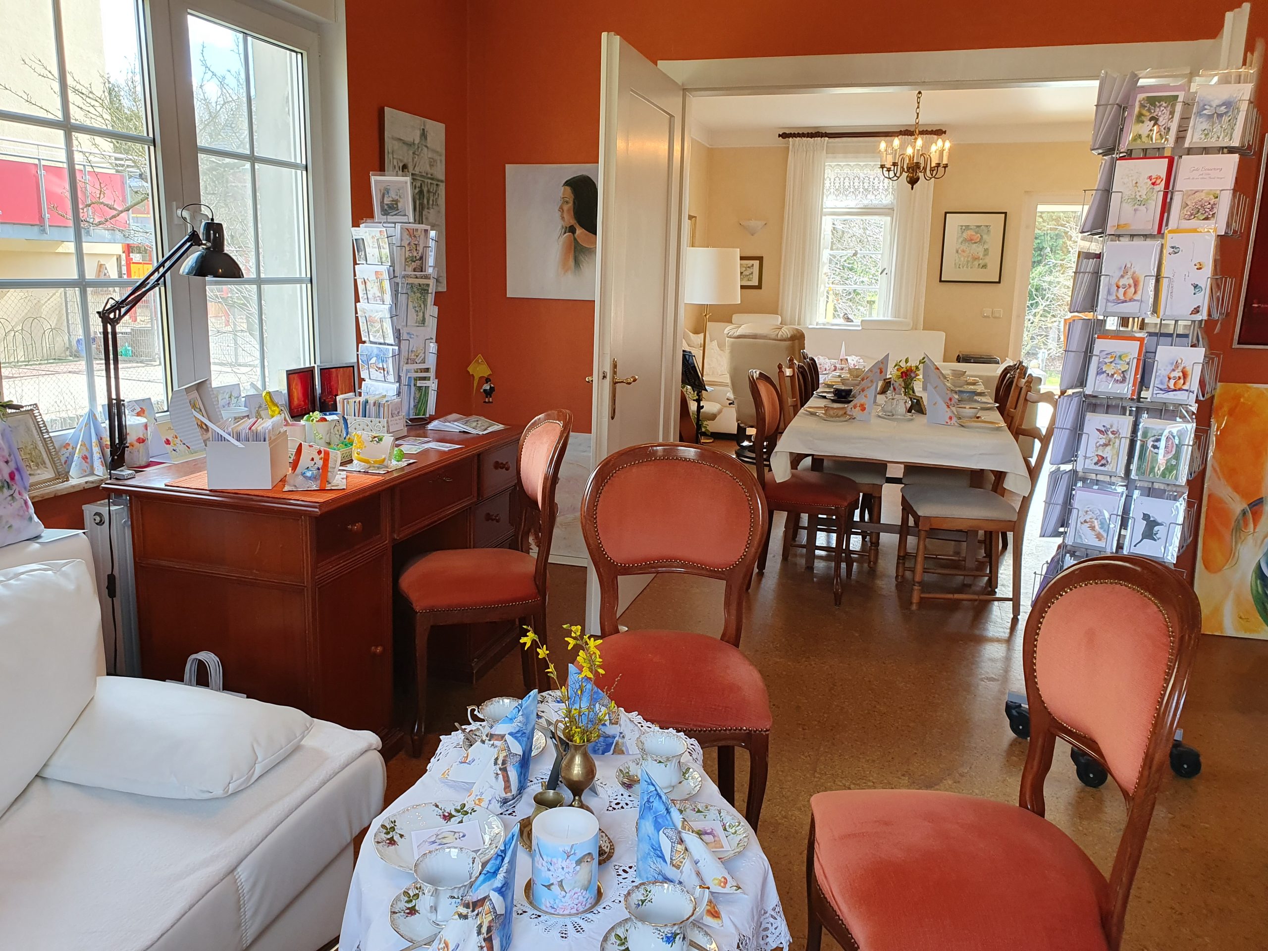 An ausgewählten Samstagnachmittagen lädt das Kunstcafé ins Atelier ein: Ausstellung von Bildern, persönliche Gespräche mit der Künstlerin, Kauf von Originalen, Karten und Geschenkartikeln, sowie Beratung zu Auftragsarbeiten. Mit Kaffee, Kuchen und musikalischer Lobpreiszeit ab 14:30 Uhr. Anmeldung für die ersten zwei Stunden empfohlen.